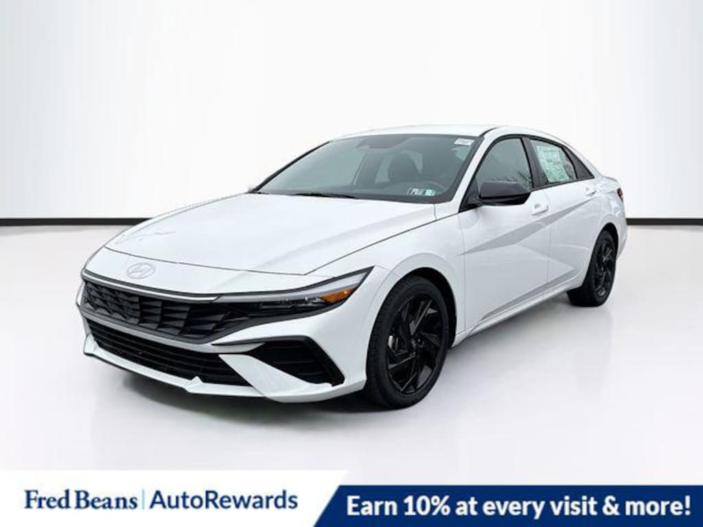 Serenity White 2026 Hyundai Elantra SEL Sport FWD CVT I4 4-Wheel Disc Brakes, 6 Speakers, ABS brakes, Air Conditioning, All-Season Fitted Liners, Alloy wheels, AM/FM radio, Apple CarPlay & Android Auto, Auto High-beam Headlights, Automatic temperature control, Brake assist, Bumpers: body-color, Cargo Net, Cargo Tray, Carpeted Floor Mats, Center Console Tray, Delay-off headlights, Driver door bin, Driver vanity mirror, Dual front impact airbags, Dual front side impact airbags, Electronic Stability Control, Exterior Parking Camera Rear, First Aid Kit, Front anti-roll bar, Front Bucket Seats, Front Center Armrest, Front dual zone A/C, Front reading lights, Front wheel independent suspension, Fully automatic headlights, Illuminated entry, Low tire pressure warning, Occupant sensing airbag, Option Group 01, Outside temperature display, Overhead airbag, Overhead console, Panic alarm, Passenger door bin, Passenger vanity mirror, Power door mirrors, Power steering, Power windows, Premium Cloth Seat Trim, Radio: AM/FM/HD Display Audio, Rear side impact airbag, Rear window defroster, Remote keyless entry, Security system, Speed control, Speed-sensing steering, Spoiler, Steering wheel mounted audio controls, Tachometer, Telescoping steering wheel, Tilt steering wheel, Traction control, Trip computer, Variably intermittent wipers, Wheels: 17" x 7.0J Alloy Gloss Black w/Dark Finish.