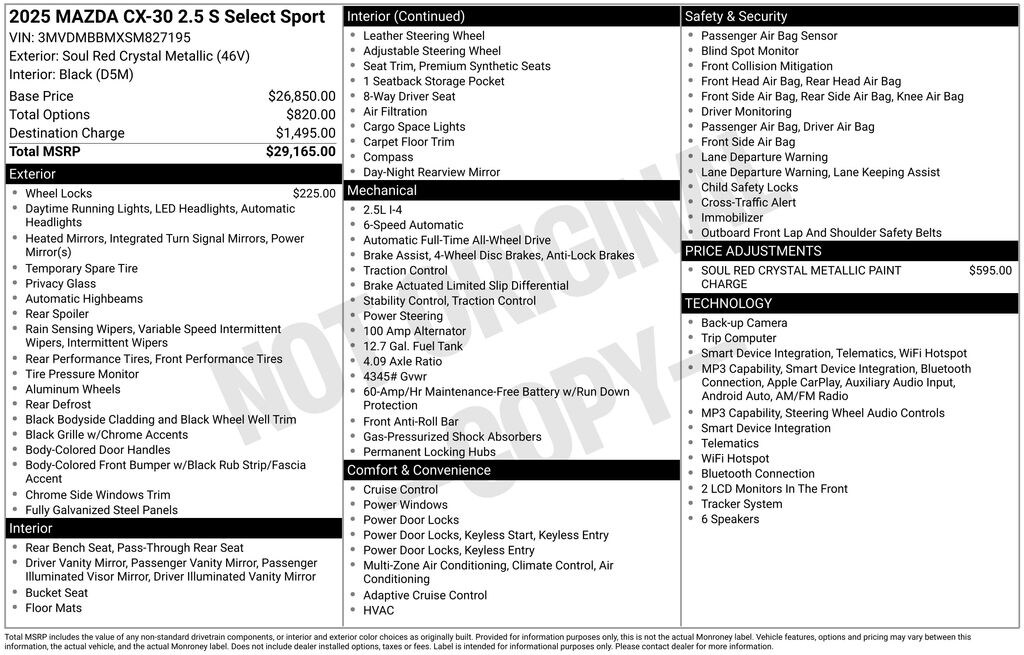 Designed with your comfort and convenience in mind, the CX-30 2.5 S Select Sport boasts a host of premium features, including a Bose® premium audio system, heated front seats, and a panoramic moonroof. The spacious interior and versatile cargo area ensure that you can easily accommodate your family, friends, and all your adventures.